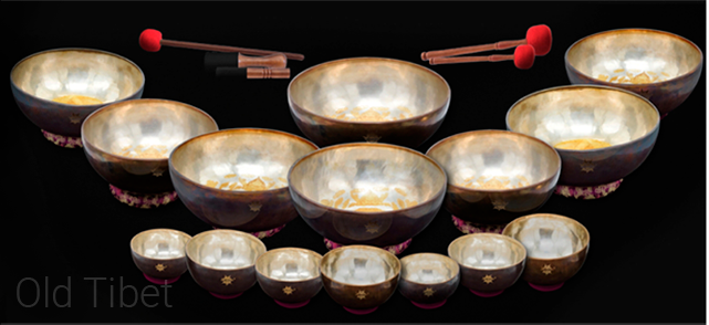 2. Набор 14 поющих чаш для акустических индивидуальных и групповых сеансов, медитаций и массажа состоит из универсального набора 7 чаш 108 – 240 Гц (19 – 30 см) и акустического набора 7 чаш 240 – 450 Гц (12 – 18 см). Отдельные чаши в наборе не являются абсолютно уникальными. Подобные чаши редкого качества можно найти в продаже, хотя это совсем не просто. Уникальным является сочетание чаш в наборе. Критически важно искусство составления комбинации чаш таким образом, чтобы каждая чаша звучала в гармоничном резонансе с остальными.